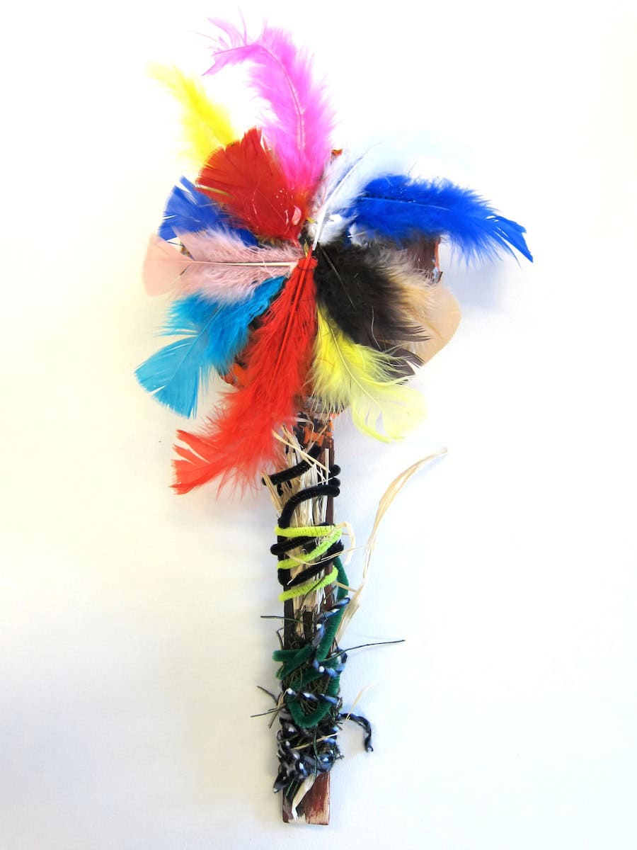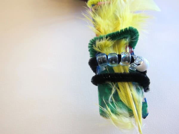 After paint had dried, the students could glue on fabric pieces, faux fur, leather scraps and feathers (I used a hot glue gun to secure these.) Finally, they could wrap and tie pipe cleaners, yarn, raffia and beads to the handle.
