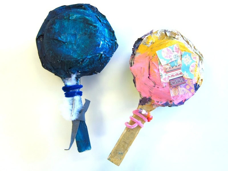 Dip the newspaper strips in paper mache and smooth out on top of the rattle. Completely cover the surface of the rattle wrapping it to the edges. Most students will finish one side during the class period. To dry, I lined them all standing straight up on the top of my drying rack (not touching each other). They will dry overnight, so try not to have any other projects that need the drying rack after this class (the paper mache will drip.) During the next class period, flip over the projects and paper mache the other side.