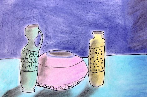 The kids use a reference sheet of vase shapes, like the one here. The students draw their vases with pencil. I encourage them to include overlapping.