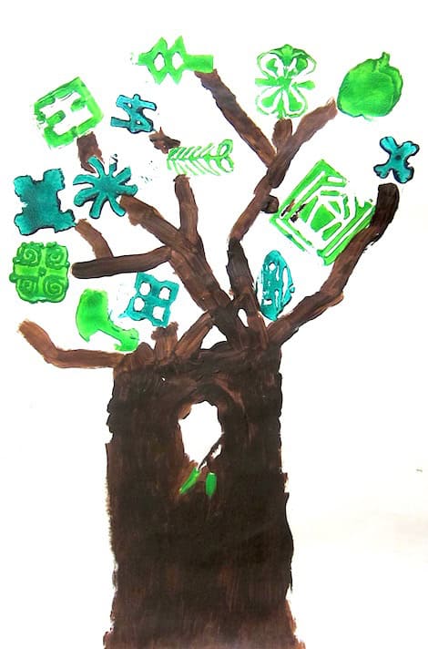 I would probably use it only with grades 5 and up, but that’s my comfort level. Demonstrate how to make sure that you only carve in front of your other hand, carving away from your body. I constantly observe the kids as they start cutting and make sure they are all holding the tools properly and continually remind them to carve away from their other hand. We have had a few cuts, but nothing serious. As for set up, I show the kids how to change out the nibs to other sizes and I let them come up and change out nibs as they need to. When it’s time to print, they just carefully pour out a small amount of acrylic paint onto newspaper. Then, they dip their foam brush into the paint and paint it on the stamp. I show them how to be careful not to get their hands too dirty while holding the stamp, and to wash their hands often if they get paint on their fingers to avoid smudging their papers. If they use multiple colors, they either need to get a new brush or wash the other one really really well. Luckily the foam brushes are pretty cheap. At the end of the class, I sometimes will just have them throw all their stamps and brushes in the sink and have one volunteer wash everything, or I will just wash it all.