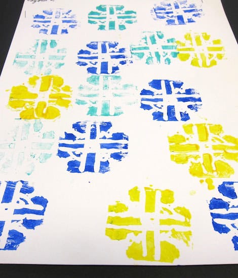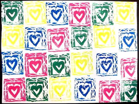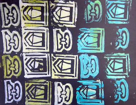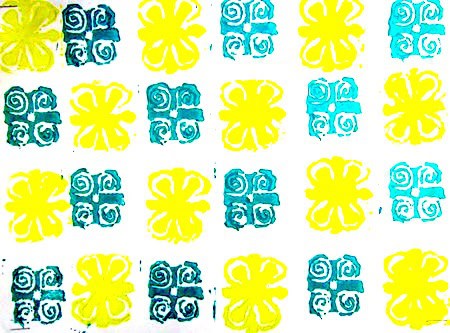 They used linoleum cutters to carve their own rubber stamps on the Dick Blick Art soft carving stamps. We brushed on acrylic paint with soft foam brushes