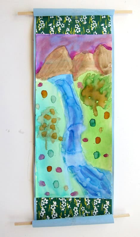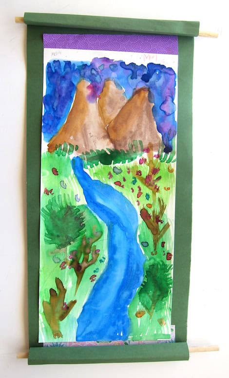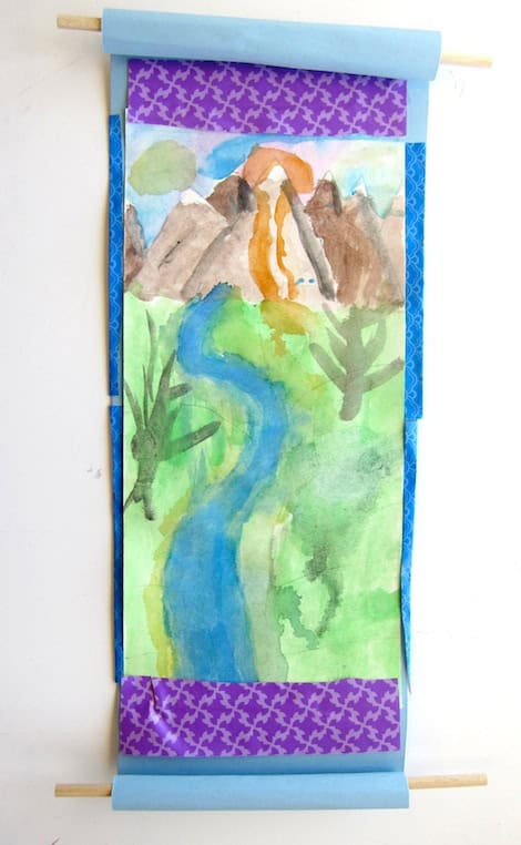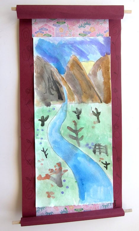 Dowel rods were hot glued to paper and rolled up. (This was a great task for my older student helpers.) Paper should be pre-cut to a long rectangular size. The watercolor paper should be the same shape, but slightly smaller. Pre-cut origami paper for the borders.