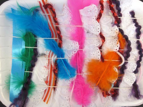 3. Weave over and under using pieces of yarn, ribbons, pipe cleaners, feathers or rolled tissue paper.